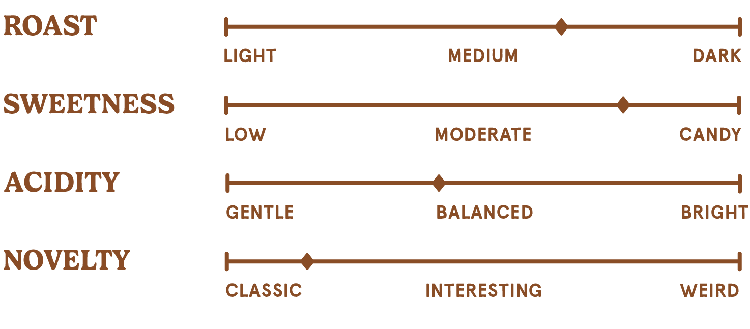 A nutty and buttery blend with chocolate cake sweetness and stone fruit acidity.